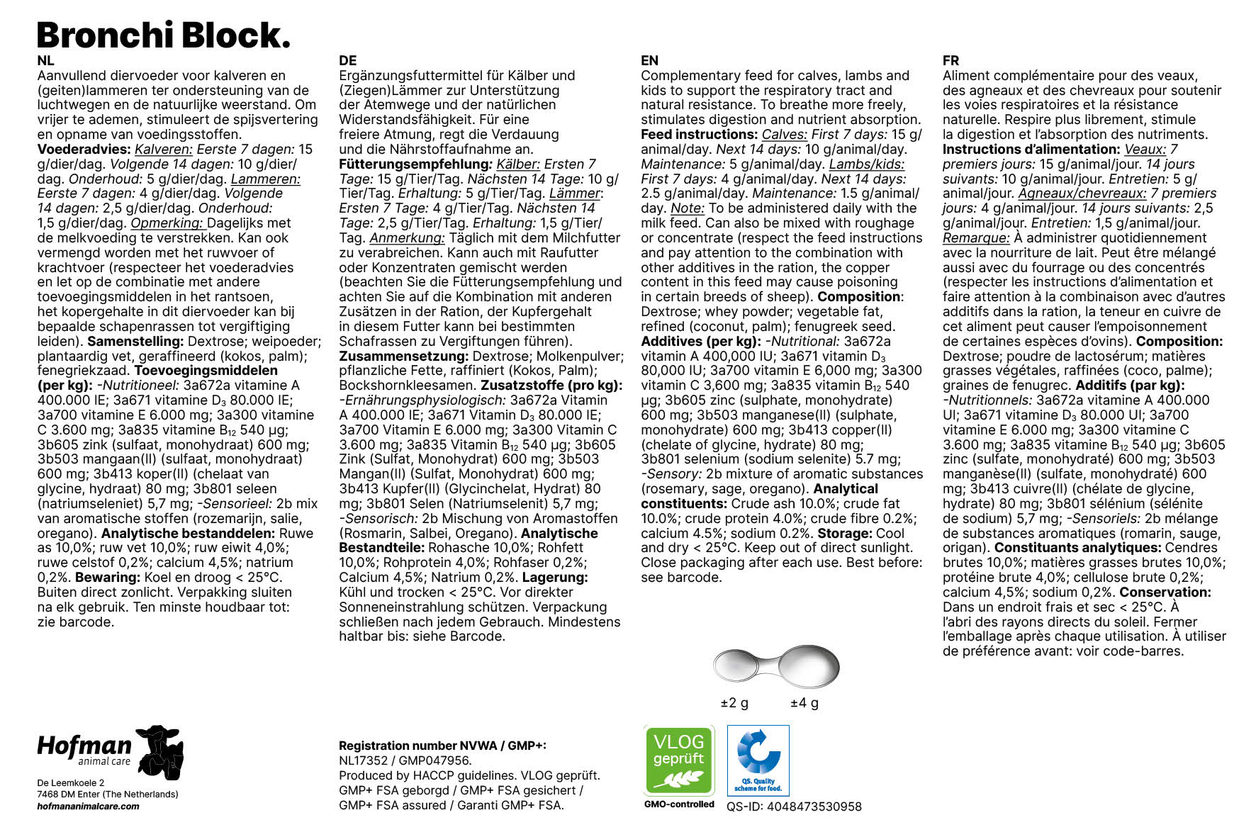 Bronchi Blok is een aanvullend diervoeder voor kalveren en (geiten)lammeren.