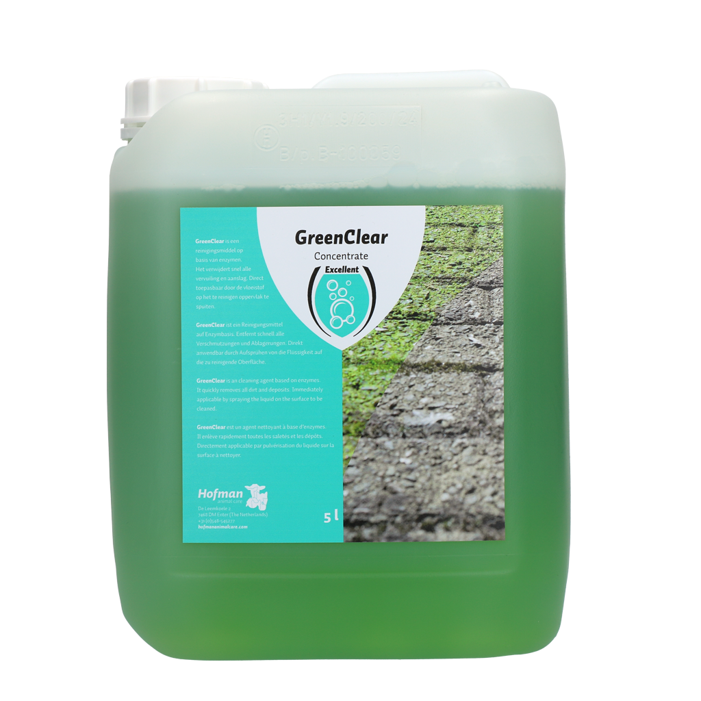 GreenClear is een milieuvriendelijk reinigingsmiddel op basis van enzymen. Het verwijdert snel alle vervuiling en aanslag. Direct toepasbaar door de vloeistof op het te reinigen oppervlak te spuiten.