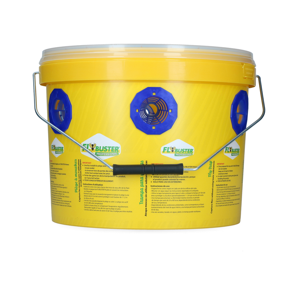 Plaats de 6 stuks ‘one way’ openingen op juiste wijze in de val. Vul de val met 240 gram lokstof en voeg 6 liter water toe. Monteer de deksel en plaats de FlyBuster Trap op 1,50 meter hoogte. Houdt hierbij rekening met een afstand van 10-15 meter tot het object dat vliegenvrij moet blijven. De onderlinge afstand bij gebruik van meerdere vallen bedraagt 15 meter. Het is belangrijk dat de val in de zon en uit de wind staat (bijv. niet bij ventilatoren). De FlyBuster Trap is klaar voor gebruik!