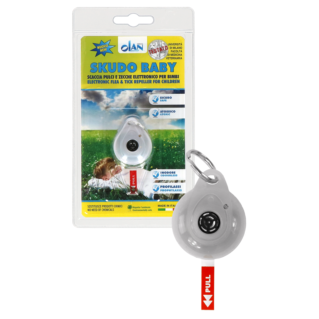 Aangezien kinderen gevoelig en kwetsbaar zijn, hebben ze soms extra bescherming nodig. Skudo Baby is de natuurlijke en veilige oplossing welke geen risico's met zich meebrengt. Vlo-beten zijn vaak de oorzaak van allergische dermatitis,vanwege hun allergeenrijke speeksel. Het apparaat geeft een reeks ultrasone impulsen die de parasieten storen. Stoort mensen en huisdieren niet, waardoor kinderen die in parken, tuinen of met hun hond / kat spelen, beschermd blijven. De Skudo kan worden bevestigd aan de kinderwagen, de pols, de nek, (met het geperforeerde deel richting de huid). Zodra het rode lipje is verwijderd, werkt het apparaat continu voor 10/12 maanden dankzij een niet-oplaadbare batterij. Het is vocht-en waterbestendig en gebruikt geen vervuilende chemicaliën.