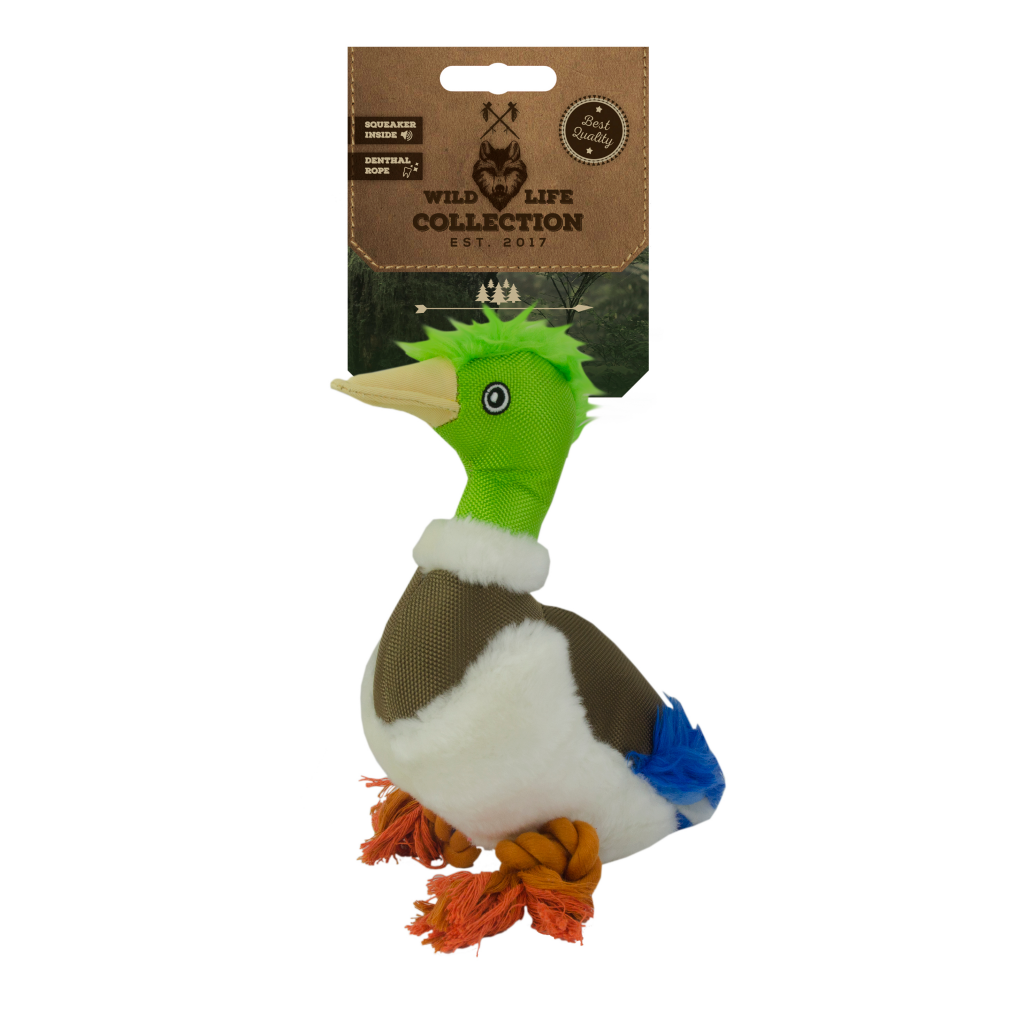 De Wild Life collection bestaat uit natuurgetrouwe pluche hondenspeeltjes. De vacht is gemaakt van zacht pluche en deze eend heeft een flostouw en een pieper.