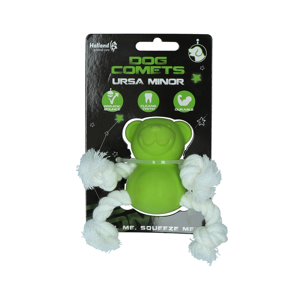 Deze vrolijk gekleurde beer stuitert alle kanten op en is super duurzaam. Het zachte touw masseert het tandvlees en helpt zo tanden en tandvlees schoon te houden.