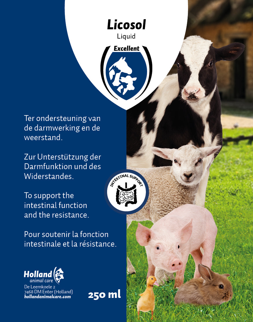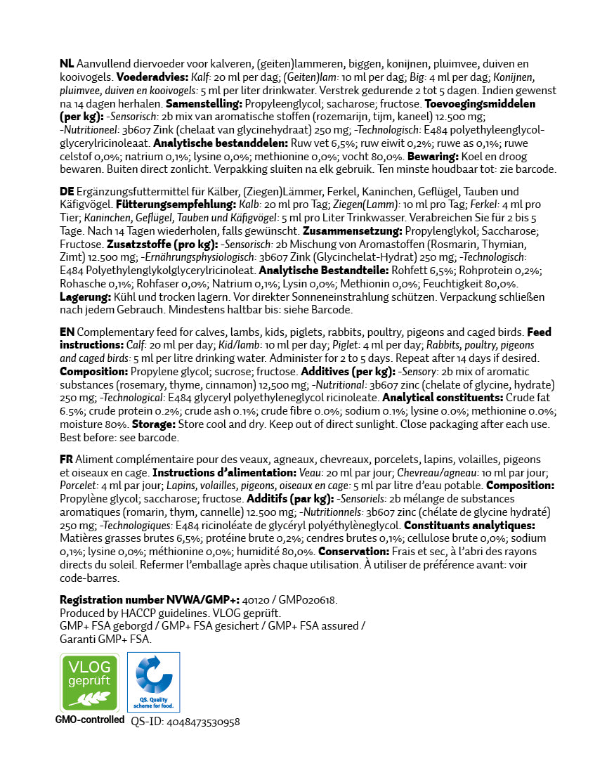 Aanvullend diervoeder voor kalveren, (geiten)lammeren, biggen, konijnen en pluimvee ter ondersteuning van de darmwerking en de weerstand.