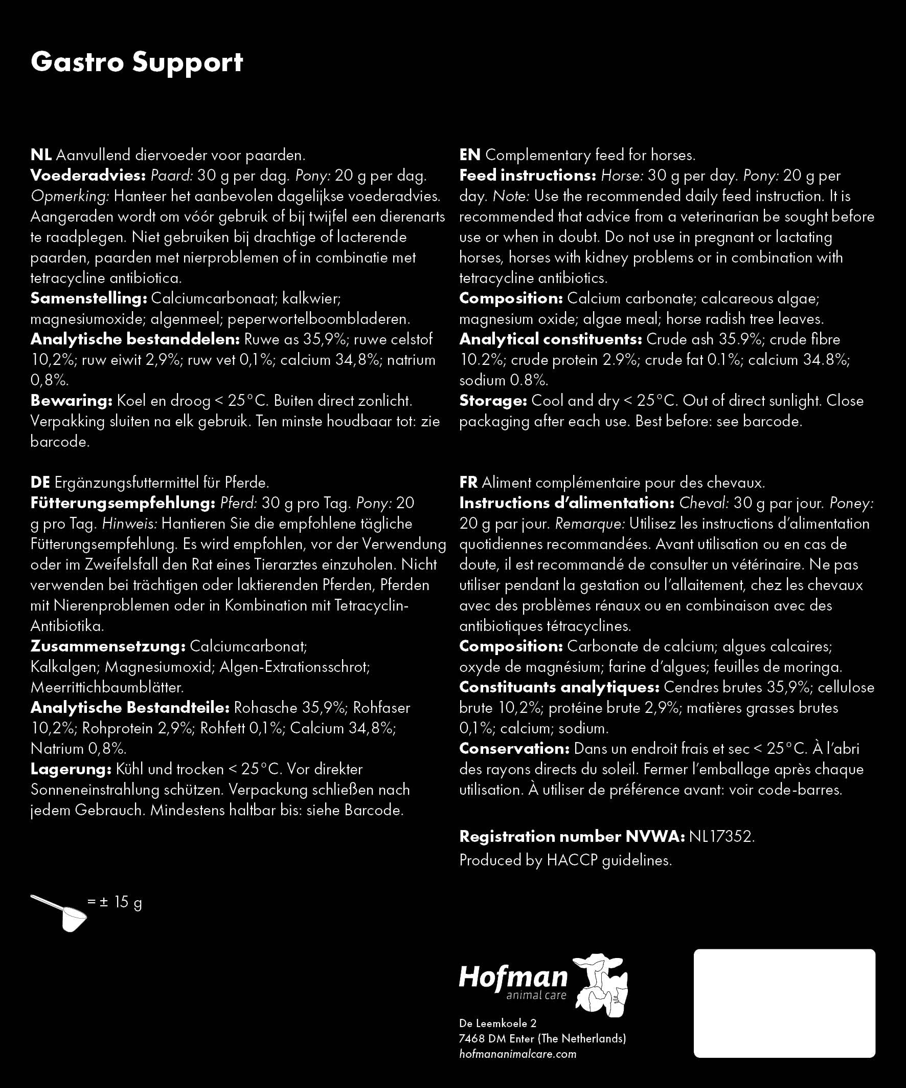 Equi Gastro Support bevat een unieke en effectieve samenstelling met specifieke ingrediënten. Kalkhoudende alg zorgt voor ondersteuning en behoud van een normale maagzuurgraad en het neutraliseren van overdadige maagzuurvorming. Calciumcarbonaat zorgt voor het neutraliseren van de maaginhoud om de maag tot rust te brengen.