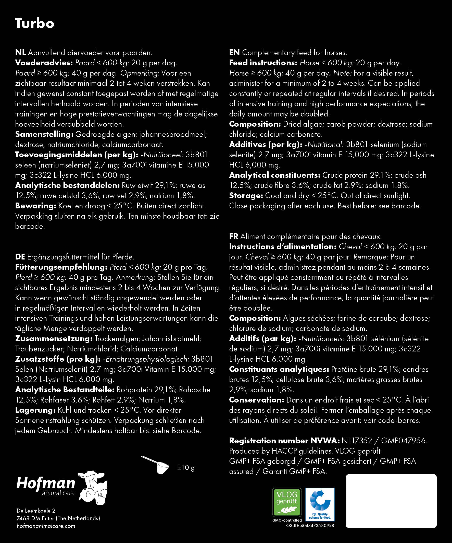 De gekweekte algensoort in de Equi Turbo is zeer rijk aan vitaminen, mineralen en aminozuren voor opbouw en bescherming van de spieren.