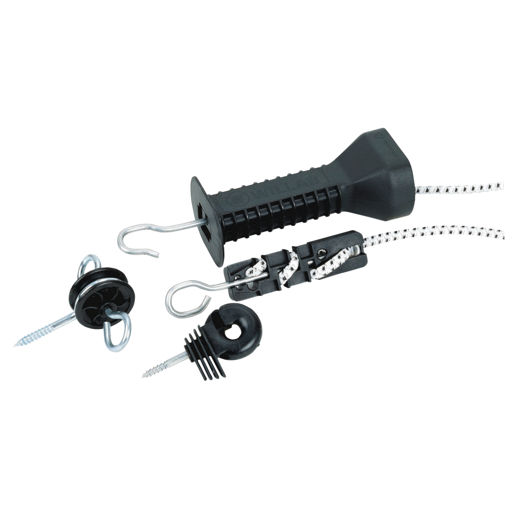 Gemaakt van duurzaam elastiek met daarin stroomgeleidedraden. Set bestaat uit: poortgreep, elastiek, ringisolator en poortgreepanker.