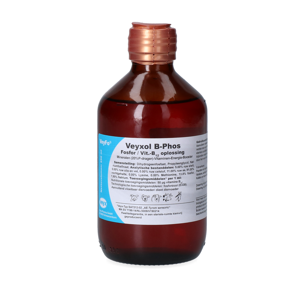 Veyxol B-Phos is een aanvullend diervoeder voor melkkoeien. Ook is het in te zetten als een op de behoeften afgestemde aanvulling van het dagrantsoen van andere diersoorten, zoals varkens, honden en kleine knaagdieren. Bevat ingrediënten met een uitstekende biologische beschikbaarheid en is geproduceerd onder steriele condities (kiemvrij).