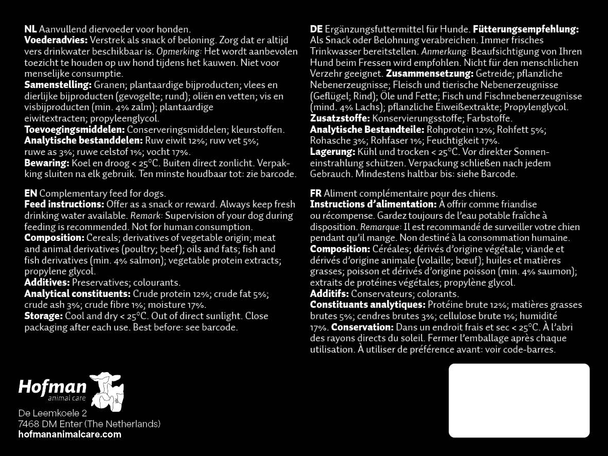 Deze trainer-snack is een semi-moist soft beloning. Dit houdt in dat deze snacks nog licht vochtig zijn en daardoor extreem krachtig zijn in smaak en geur. Daarom zijn dit ook de ideale snacks voor hondentrainers en baasjes om hun honden en pups te belonen bij goed gedrag tijdens een training of cursus. Deze trainer-snack bevat geen toegevoegde suikers en het mooiste van alles is dat deze snoepjes gemaakt zijn in Nederland!