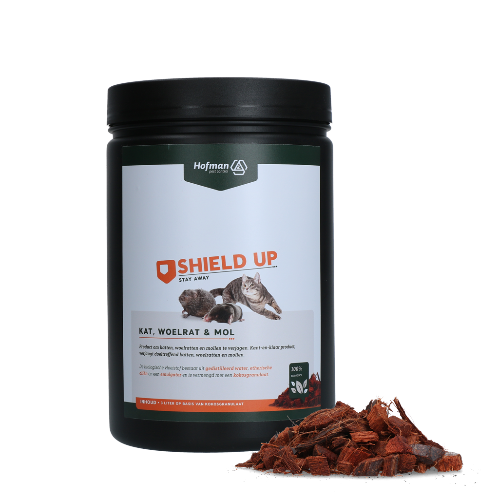 Shield Up Stay Away Kat/Woelrat/Mol is een kant en klaar product en verjaagt doeltreffend katten, woelratten en mollen.