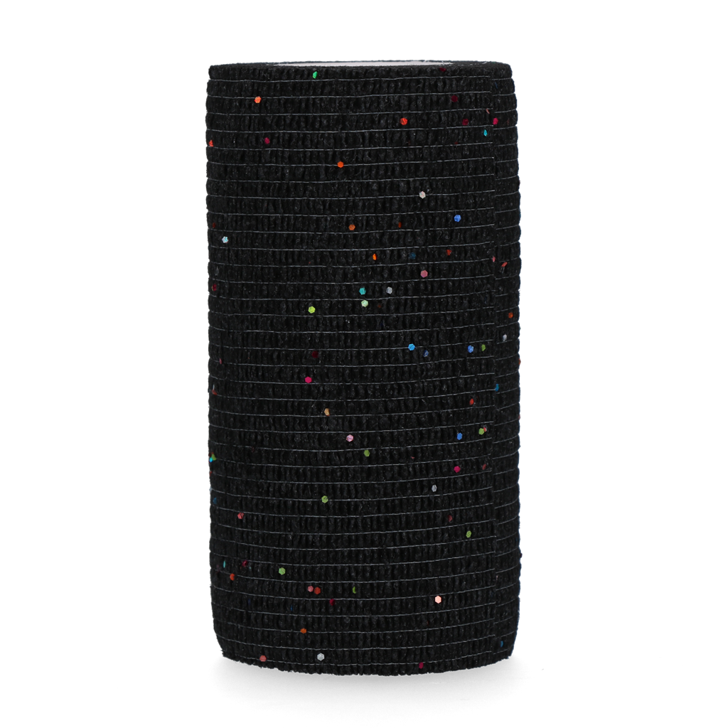 Zelfklevende, elastische en supersterke bandage met glitter. De 5 cm variant is geschikt voor snelle, effectieve behandeling van punctiewonden, schaafwonden en snijwonden. De 10 cm variant is geschikt voor het intapen van de benen en klauwen en voor het binden van pleisters, watten etc. om de benen of klauwen. De bandage is eenvoudig op maat te maken met de hand, knelt niet af en plakt niet aan huid en haar.
