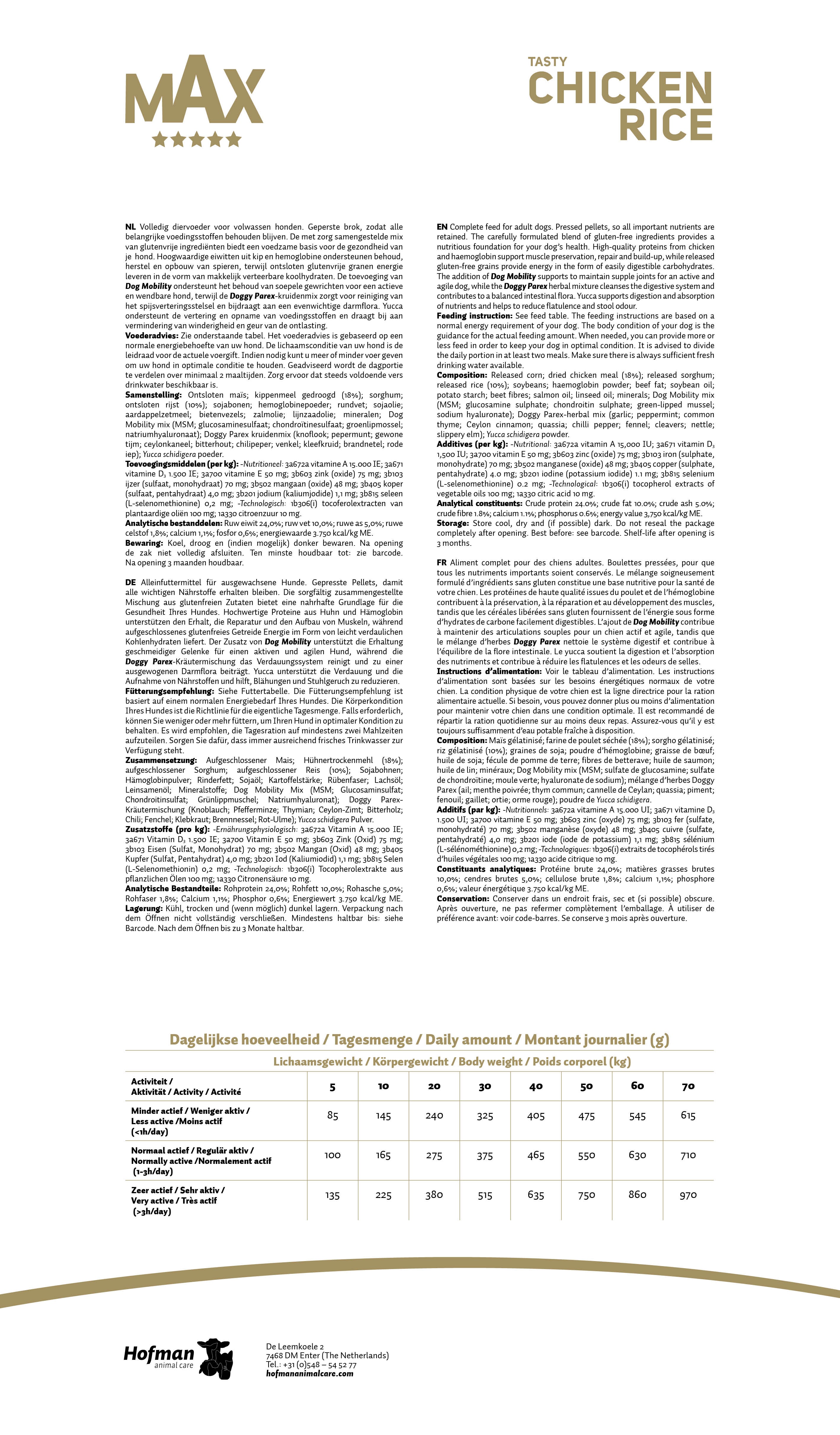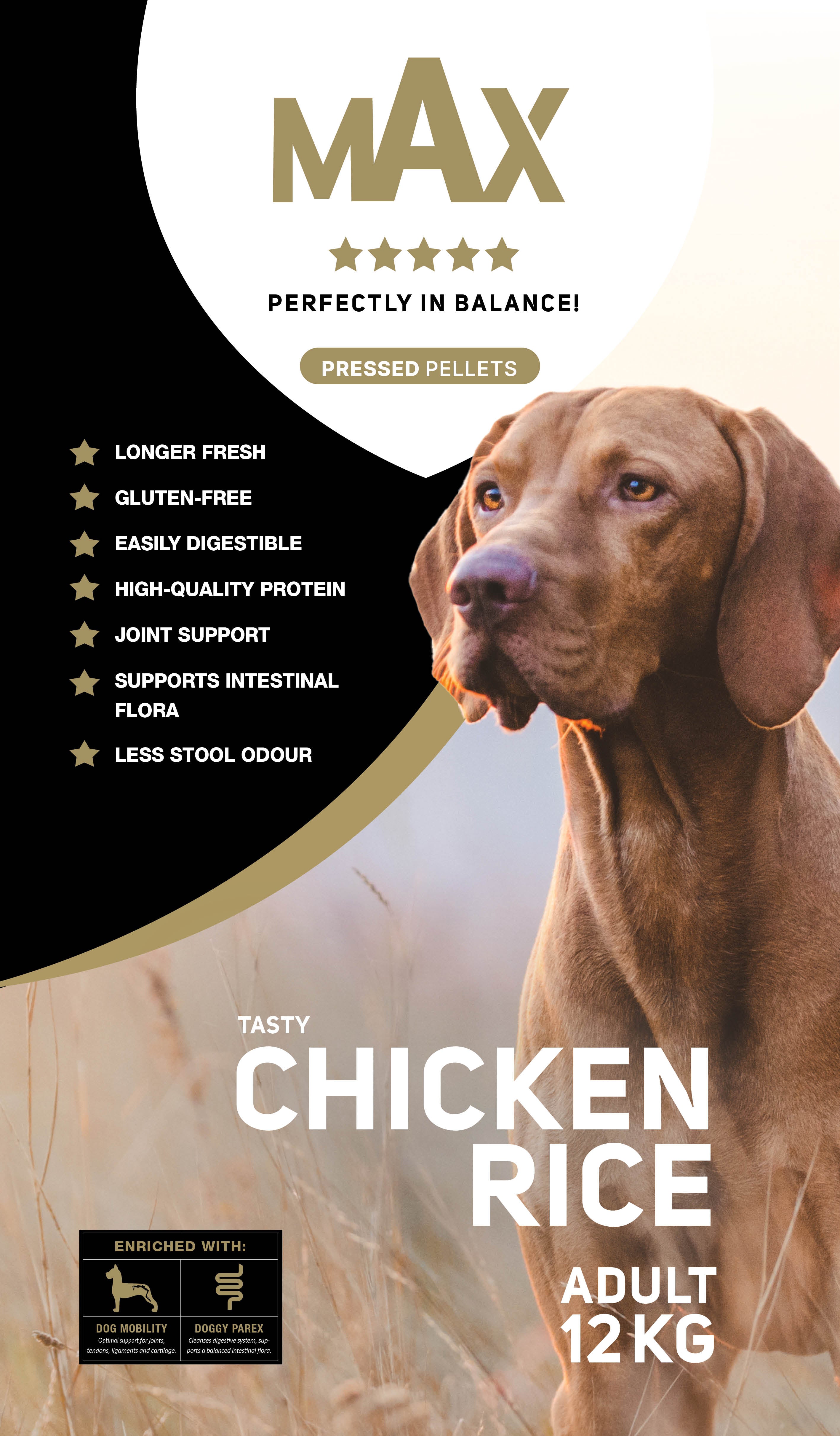 Max Adult Geperste Brokken Kip & Rijst is volledig uitgebalanceerde, 5 sterren voeding voor volwassen honden in de vorm van geperste brokken. Het helpt volwassen honden om perfect in balans te blijven. Deze voeding is verrijkt met 2 van onze aanvullende diervoeders, namelijk Dog Mobility en Doggy Parex.