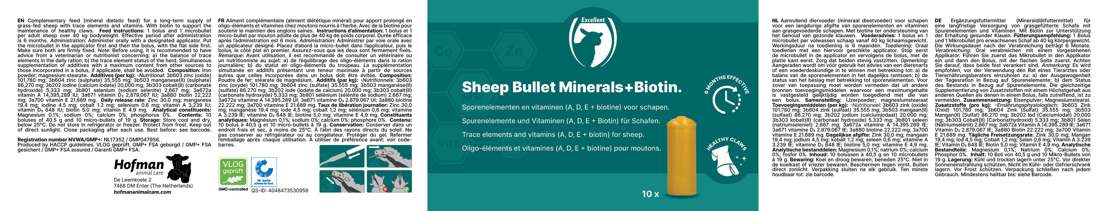 Aanvullend diervoeder (mineraal dieetvoeder) voor schapen voor een langdurige afgifte van sporenelementen en vitaminen aan grasgevoederde schapen. Met biotine ter ondersteuning van het behoud van gezonde klauwen.