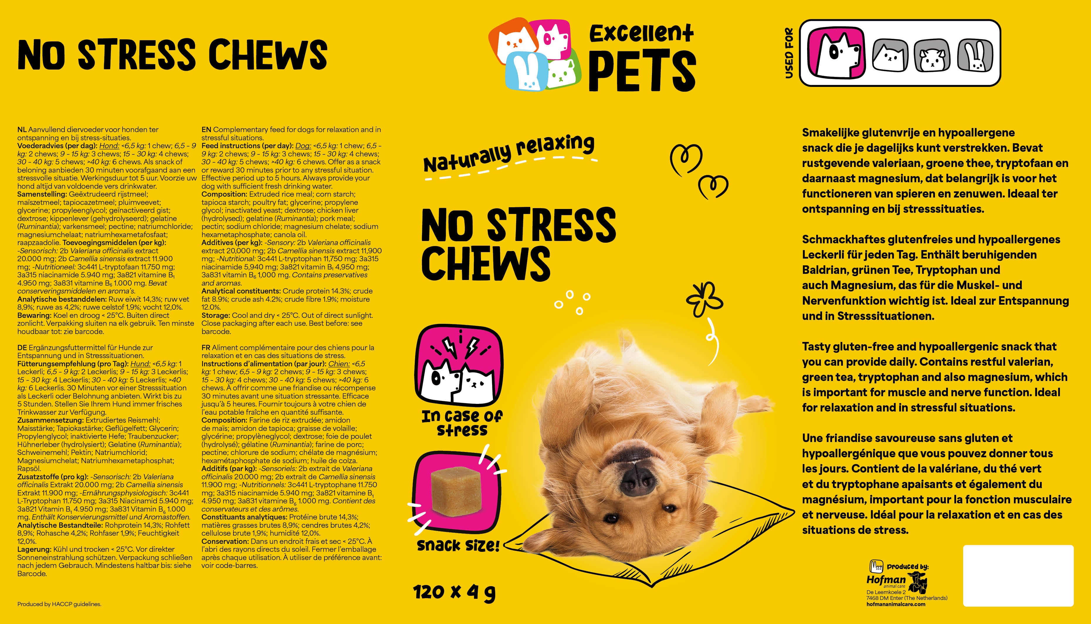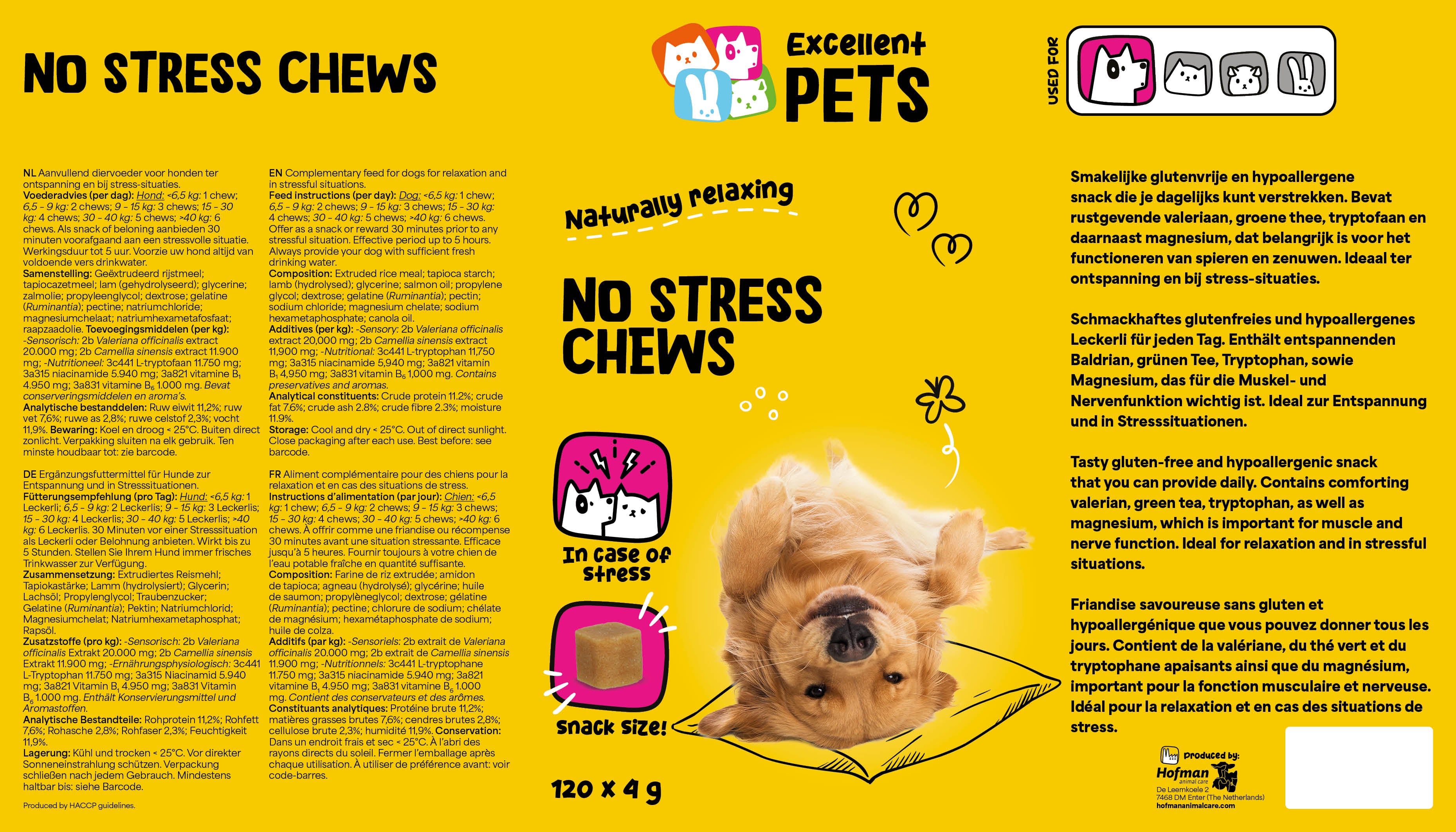 Excellent Pets No Stress Soft Chews bevat onder andere L-tryptofaan, valeriaan, groene thee en magnesium. L-tryptofaan is een essentieel aminozuur, dat bijdraagt aan de productie van serotonine, een stof die zorgt voor een gevoel van rust en welzijn. Daardoor worden honden rustiger in stressvolle situaties. Magnesium heeft een gunstig effect op het zenuwstelsel en de spieren en het stimuleert ontspanning. Valeriaan heeft een rustgevend effect en is ideaal bij spanning of in stresssituaties. Groene thee is rijk aan antioxidanten, die helpen het lichaam te beschermen tegen schadelijke invloeden.