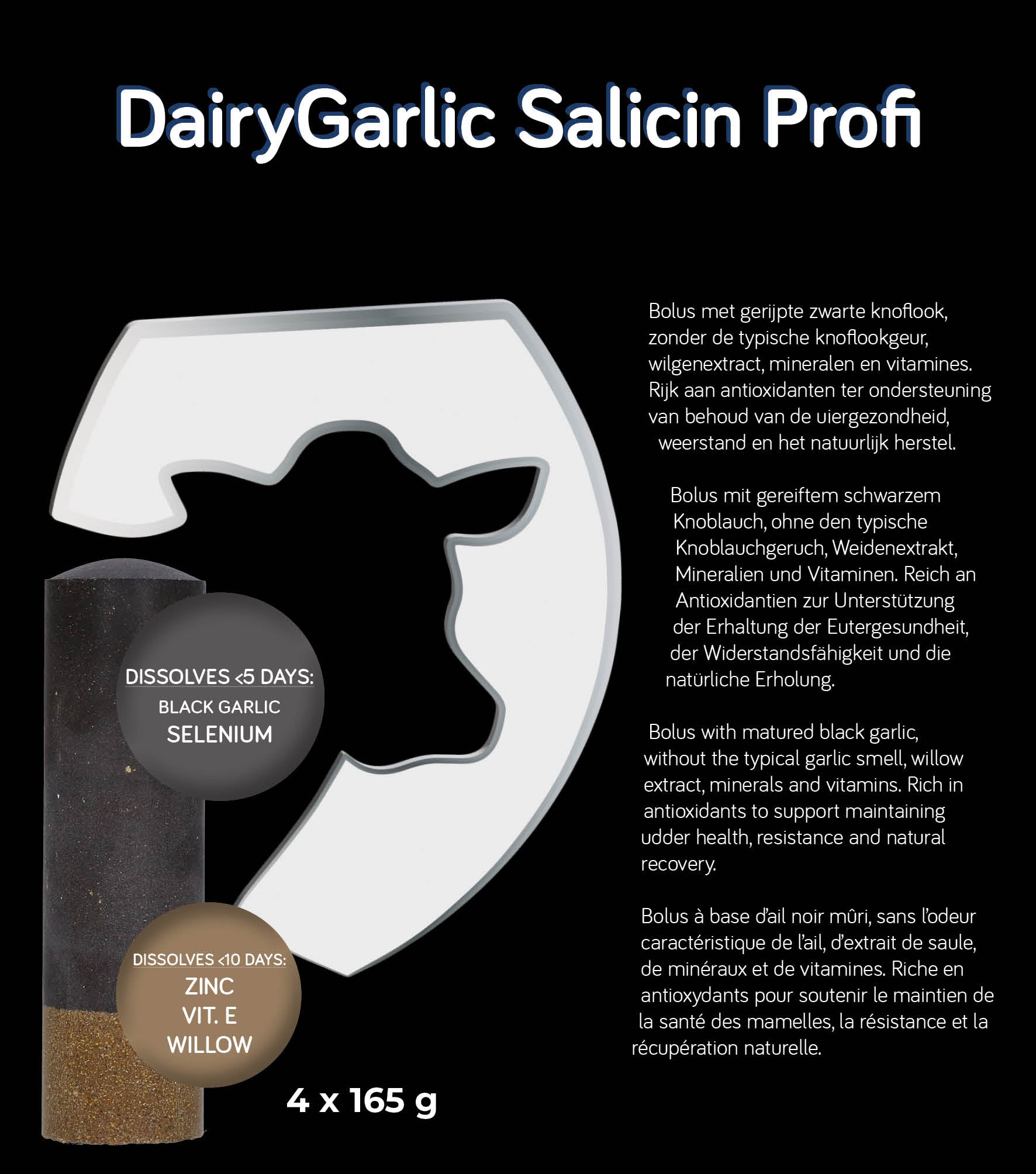 Bolus met gerijpte zwarte knoflook zonder de typische knoflookgeur. Bevat wilgenextract, mineralen en vitaminen en is rijk aan antioxidanten ter ondersteuning van het behoud van de uiergezondheid, de weerstand en het natuurlijk herstel.