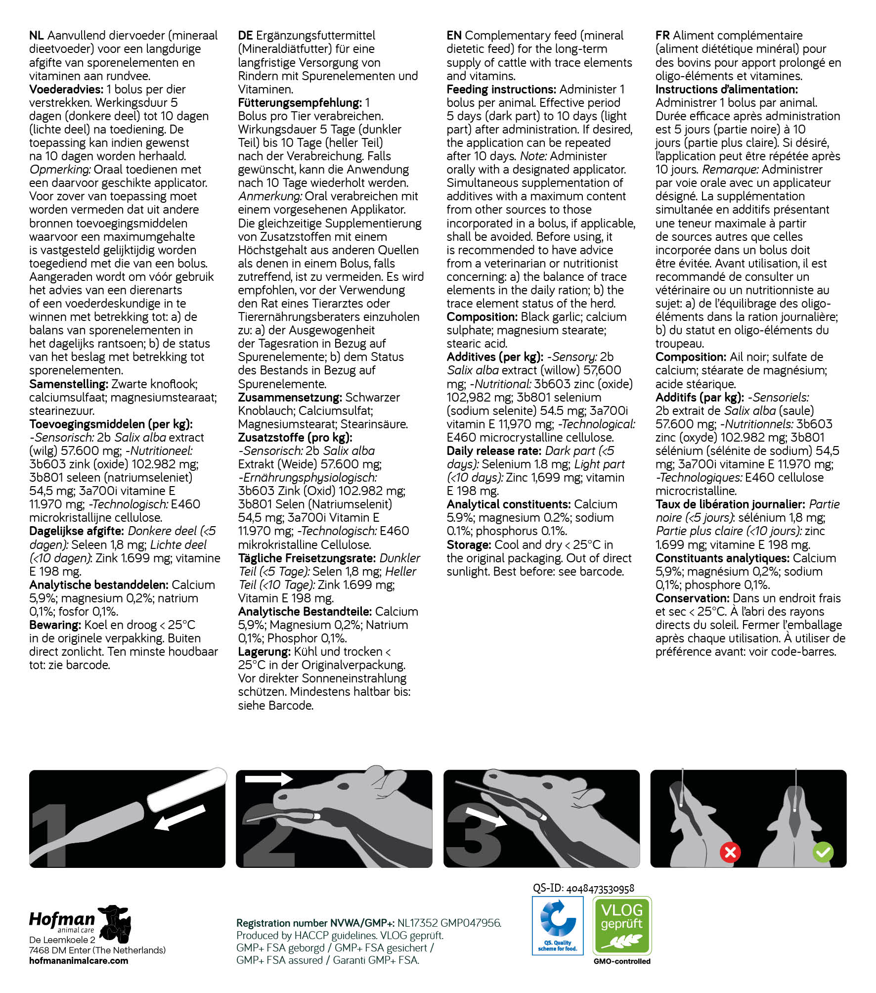 Oraal toedienen met een daarvoor geschikte applicator. Vermijd, indien van toepassing, dat uit andere bronnen toevoegingsmiddelen waarvoor een maximumgehalte is vastgesteld gelijktijdig worden toegediend met die van een bolus.