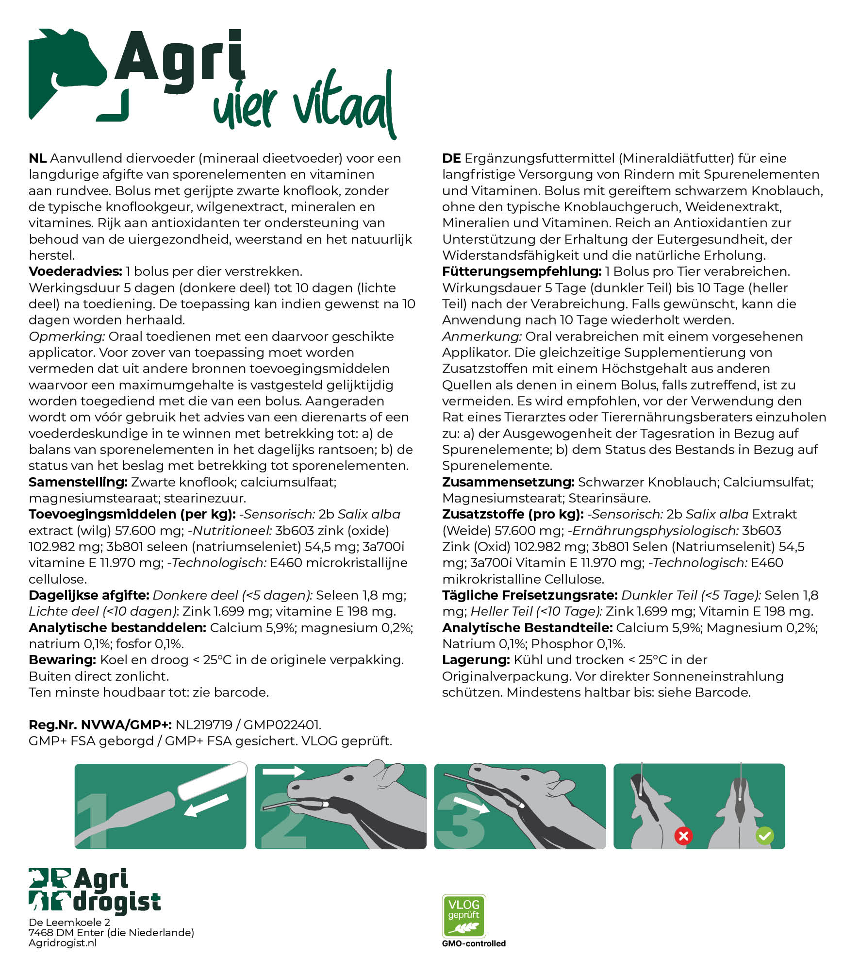 Dit aanvullend diervoeder (mineraal dieetvoeder) zorgt voor een langdurige afgifte van sporenelementen en vitaminen aan rundvee.
