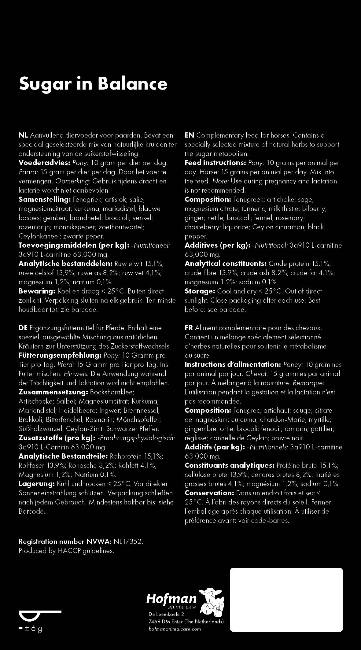 Aanvullend diervoeder voor paarden. Sugar in Balance ondersteunt in perioden van wisselende suikergehalten in het gras, bij paarden gevoelig voor suikers bij weidegang, bij paarden met overgewicht of oudere paarden. Bevat een speciaal geselecteerde mix van natuurlijke kruiden ter ondersteuning van de suikerstofwisseling.