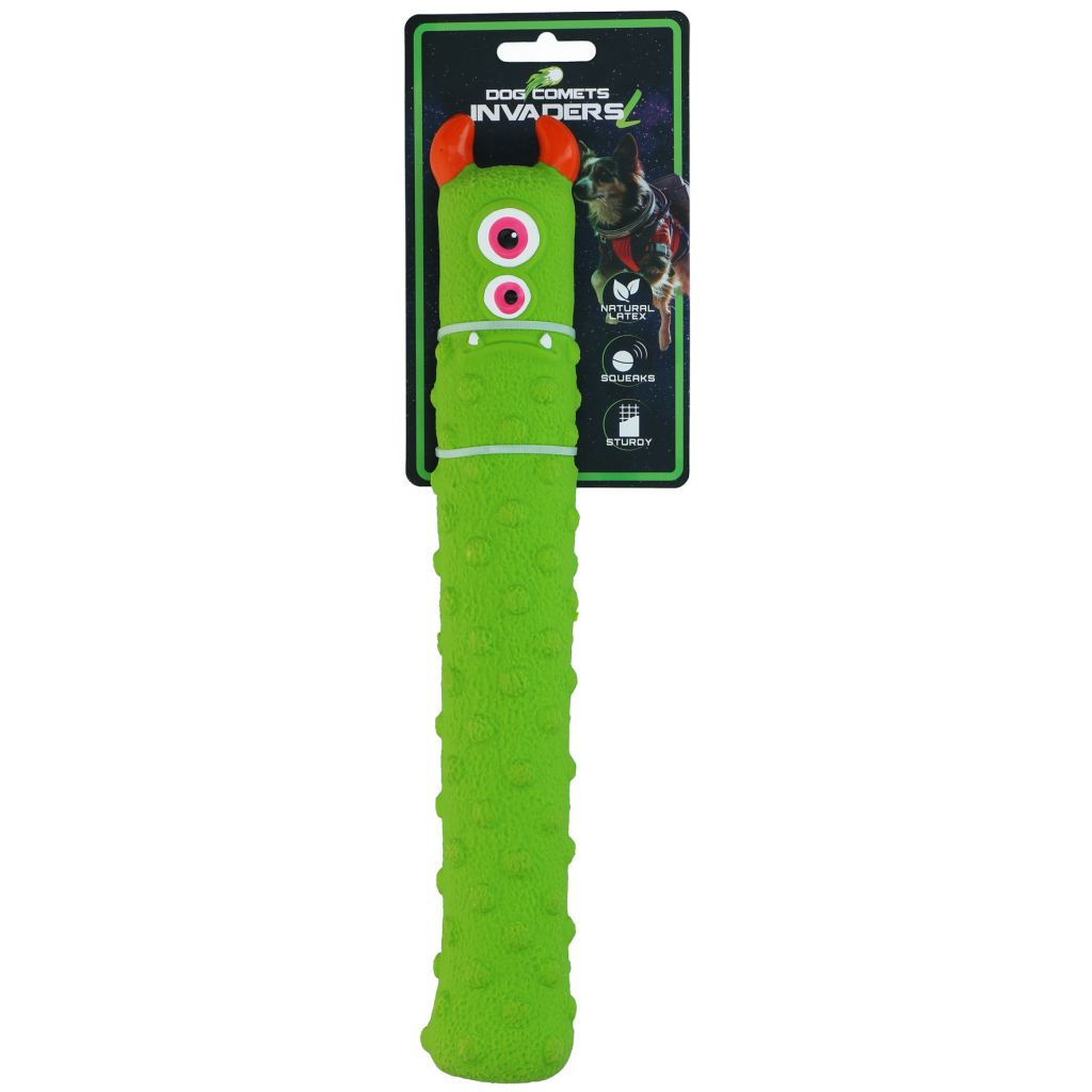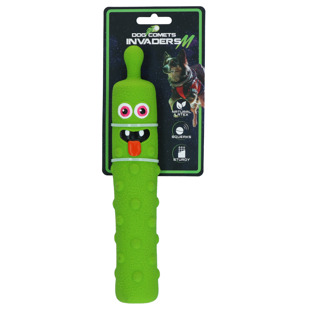 De Dog Comets Invaders Latex zijn buitenaardse indringers die klaarstaan voor avontuur met je hond. Het speeltje is gemaakt van extra dik natuurlijk latex en zorgt voor extra duurzaamheid en langer speelplezier. De ingebouwde pieper maakt het spel nog leuker en houdt honden geboeid tijdens apporteren, gooien of gewoon een actief spelmoment.