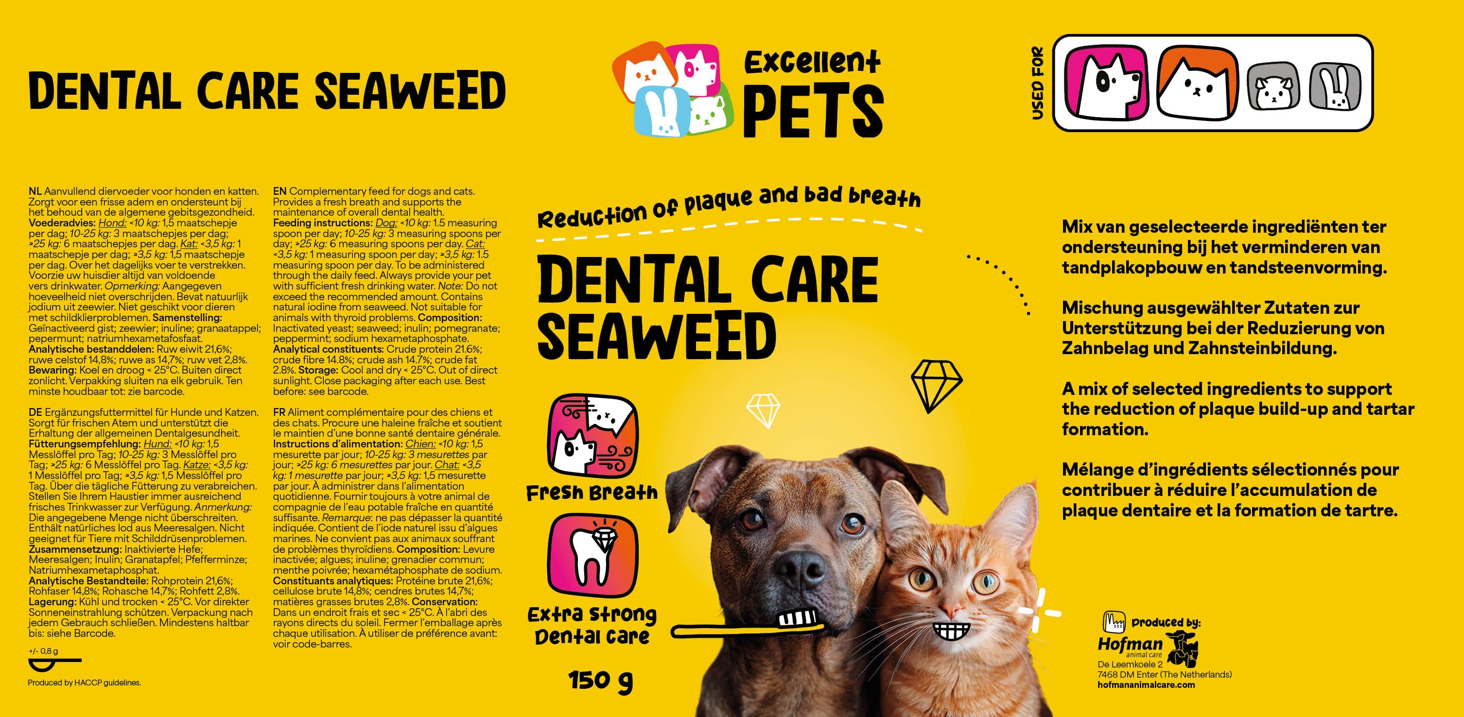 Dental Care Seaweed is een aanvullend diervoeder voor honden en katten, ontwikkeld ter ondersteuning van een gezond gebit. De mix van zorgvuldig geselecteerde ingrediënten helpt tandplak en tandsteen te verminderen, ondersteunt een frisse adem en draagt bij aan het algemene behoud van gebitsgezondheid.