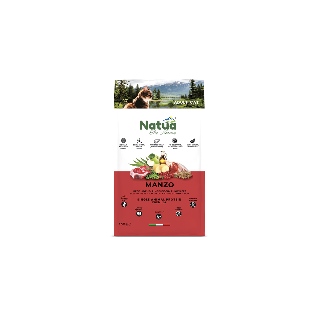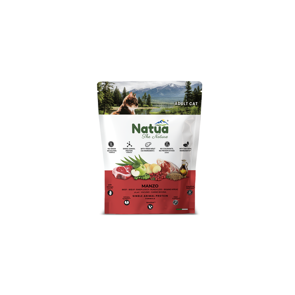 Natua Dry Line Rundvlees is een super premium droogvoeding speciaal ontwikkeld voor volwassen katten.
