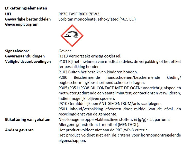 Product heeft geen etsende werking op glas, rvs, steen, rubber, trespa, lak en kunststof (niet te gebruiken op gecoat staal en zink). Bij twijfel altijd een klein proefstukje opzetten. Product bevat voornamelijk organische, natuurlijke en natuuridentieke ingrediënten. Nieuw schilderwerk 5 weken laten uitharden alvorens u het product toe gaat passen. Niet gebruiken bij extreem warm weer/warme ondergronden of bij temperaturen onder de 10°C of boven de 24°C.